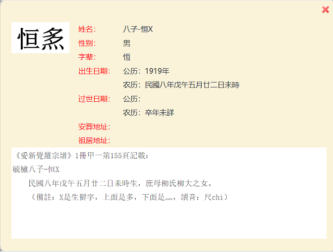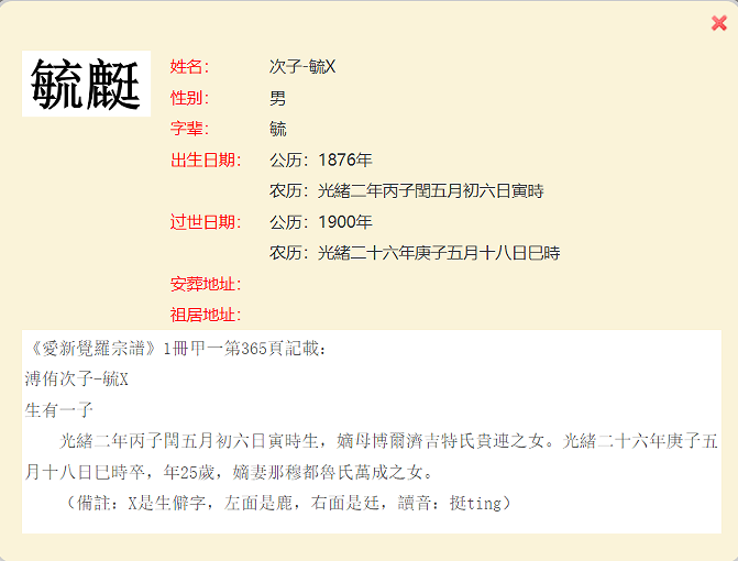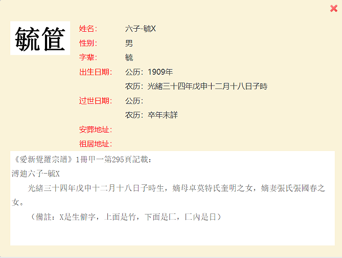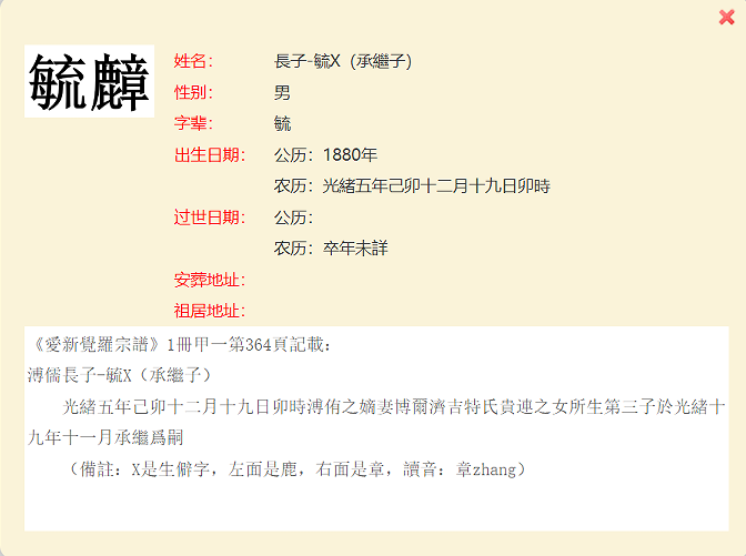 爱新觉罗宗谱第一册甲一册中,共计有20个生僻字,均出现于人名之中。其中,过继子与承继子为同一人的情况共有四例。鉴于这些生僻字超出了字库范围,电脑无法正常显示,宗谱网只得统一以字母“X”替代。在制作生僻字人工造字图片上,热心的宗谱网读者给予了无私的大力支持,对此宗谱网表示衷心的感谢!