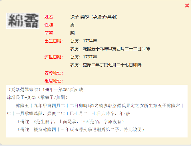 2、清高宗纯皇帝(乾隆)位下皇長子永璜的次子绵恩的第四子(115页)