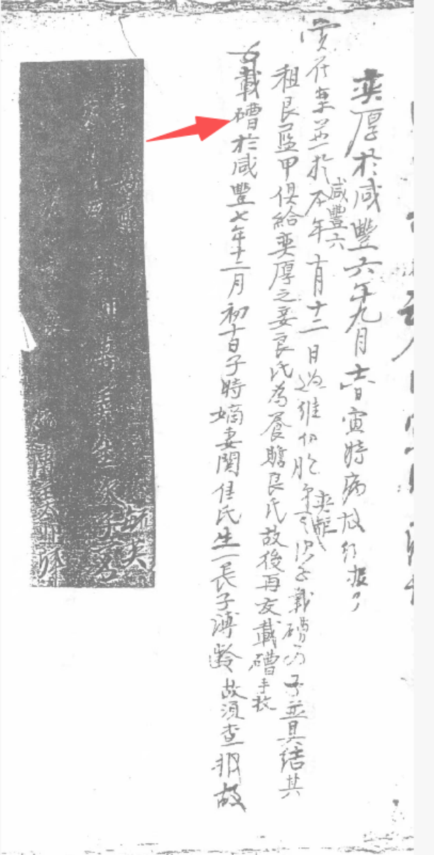“奕厚於咸豐六年九月吉寅時病故,行投???案并于本(咸豐六)年十月十二日,爲準,伊胞弟奕距之次子载��为子,并具结其租艮蓝甲俱给奕厚之妾良氏为养赡,良氏故后再交载��手收。”