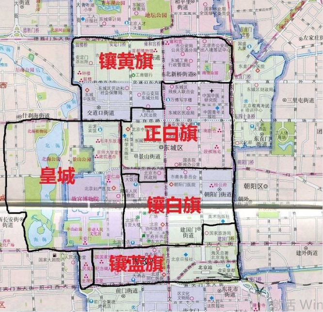 皇城在中间,东部四旗是镶黄旗、正白旗、镶白旗、正蓝旗;西部四旗是正黄旗、正红旗、镶红旗、镶蓝旗。小喵奇谈给大家说明皇城和八旗现在各自分布在城市的哪个区域,细化到每个街道。