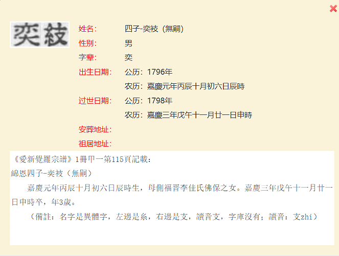 2、清高宗纯皇帝(乾隆)位下皇長子永璜的次子绵恩的第四子(115页)