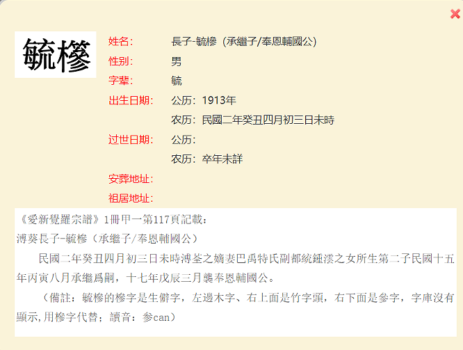3、清高宗纯皇帝(乾隆)位下皇三子永璋后裔溥葵長子(117页)