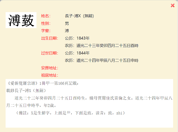 爱新觉罗宗谱第一册甲一册中,共计有20个生僻字,均出现于人名之中。其中,过继子与承继子为同一人的情况共有四例。鉴于这些生僻字超出了字库范围,电脑无法正常显示,宗谱网只得统一以字母“X”替代。在制作生僻字人工造字图片上,热心的宗谱网读者给予了无私的大力支持,对此宗谱网表示衷心的感谢!