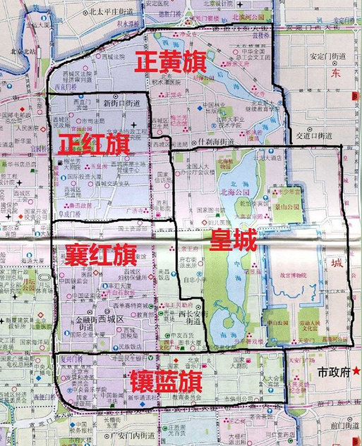 皇城在中间,东部四旗是镶黄旗、正白旗、镶白旗、正蓝旗;西部四旗是正黄旗、正红旗、镶红旗、镶蓝旗。小喵奇谈给大家说明皇城和八旗现在各自分布在城市的哪个区域,细化到每个街道。