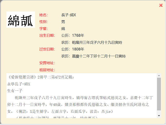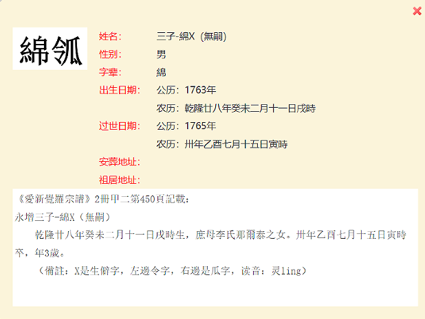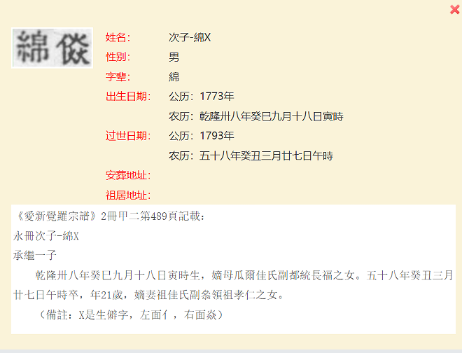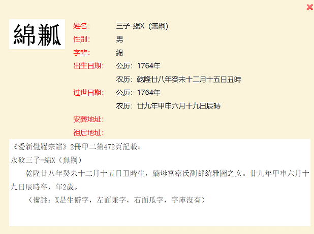 23、淸聖祖仁皇帝(康熙)位下皇十五子允祐后裔綿洵長子(758页)