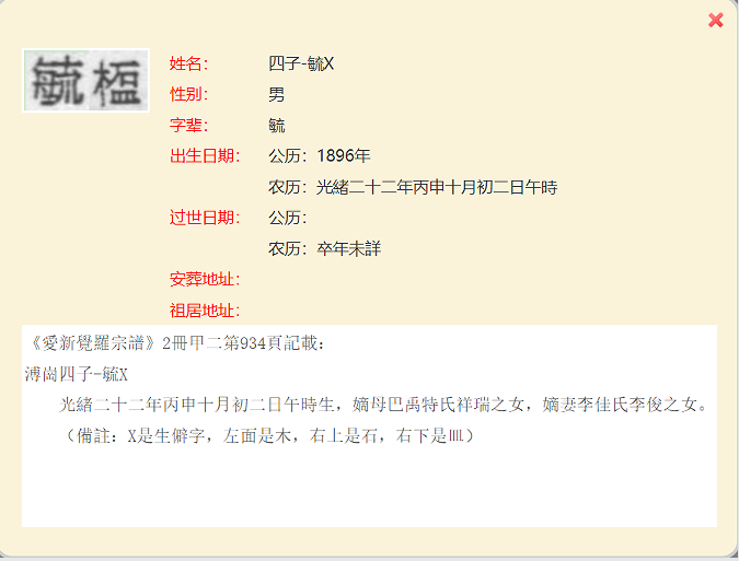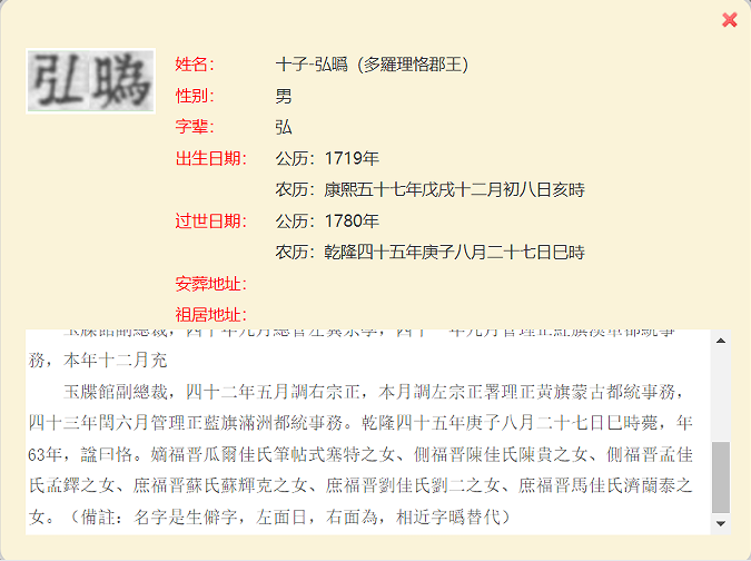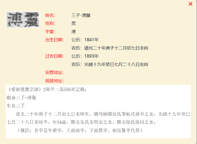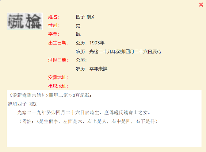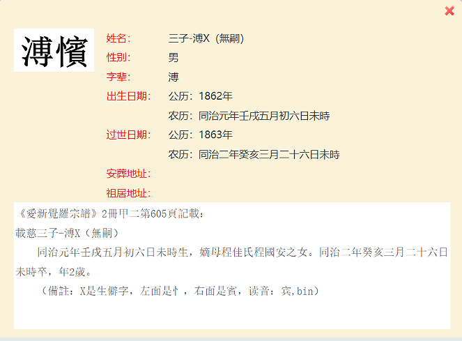 20、淸聖祖仁皇帝(康熙)位下皇十五子允祐后裔溥旭四子(730页)(读音没查到)