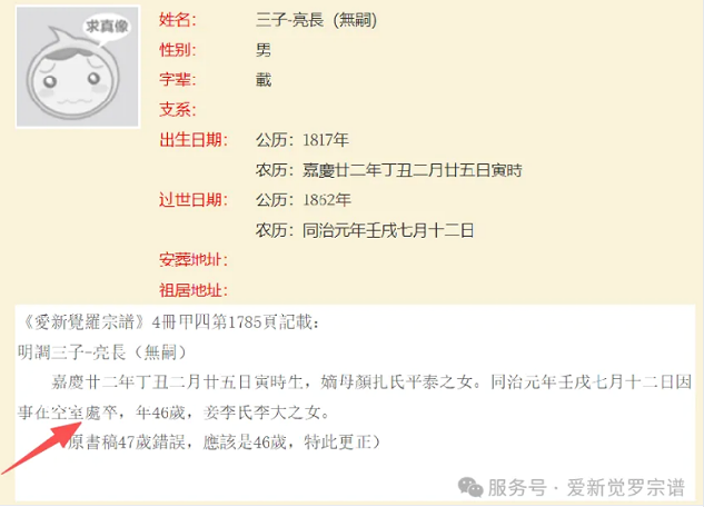 《爱新觉罗宗谱》第四册(甲四)明调三子亮长条记载:“无嗣,嘉庆廿二年丁丑二月廿五日寅时生,嫡母颜扎氏平泰之女。同治元年壬戌七月十二日因事在空室处卒,年46岁,妾李氏李大之女。”其中“因事在空室处卒”的表述,在爱新觉罗宗谱校对过程中属首次发现,引发了学界与宗谱研究者的多重解读。