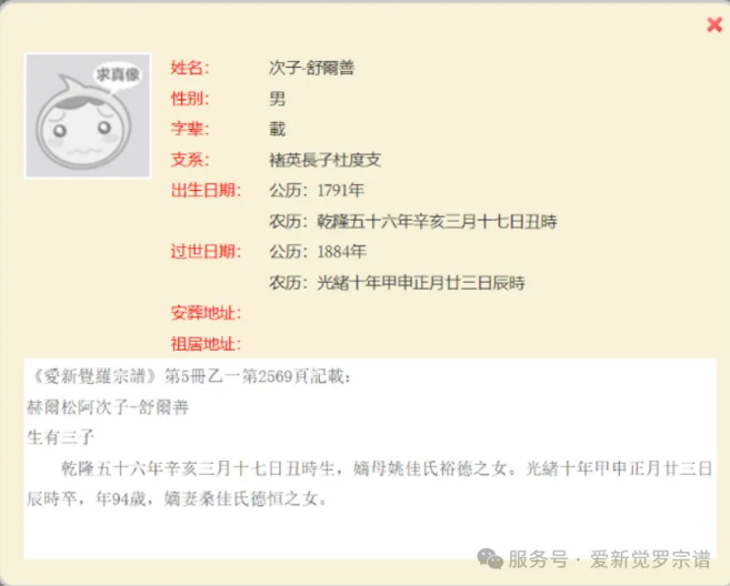 (2)高寿之最:舒尔善(1791-1884)享年94岁,历经乾隆、嘉庆、道光、咸丰、同治、光绪六朝,为本支乃至宗室中罕见之高寿者。