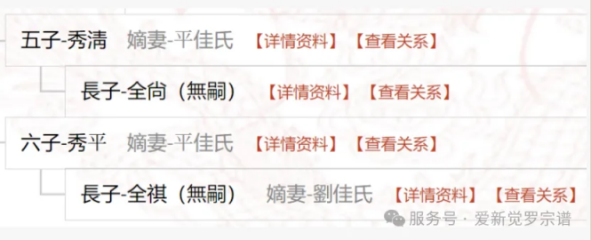 (7)孪生奇闻:秀清与秀平孪生兄弟不仅是同年同月同日生,而且是同年同月同日死(享年均为39岁),类似情况在宗谱上概率极低,是宗谱网迄今为止的首次发现。而且这孪生兄弟俩都只有一个嫡妻,嫡妻都是平佳氏,都只有一个儿子,都没有孙子,诸多个相同,只能用极为罕见来描述了。(第2635页)。